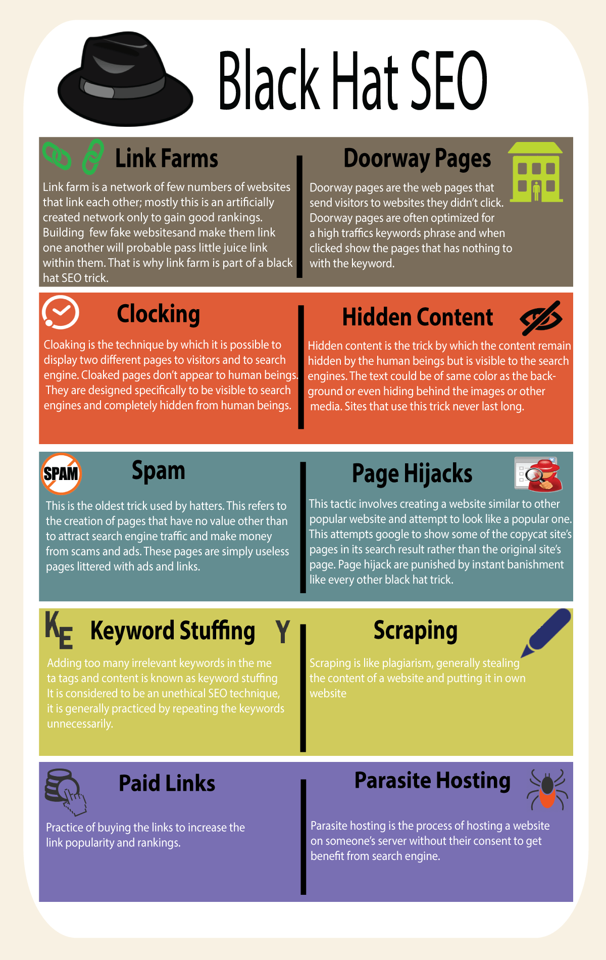 The above points are usually considered as Black Hat SEO techniques, because the spammers intend to bluff the search engines in order to rank higher, without actually dedicating time for the real and ethical SEO. Educate yourself and spread the word through sharing so that everyone gets familiar. Do let us know if you find that something is still missing and write those points in the comment section. We will get back to a different topic on the same subject some other time.